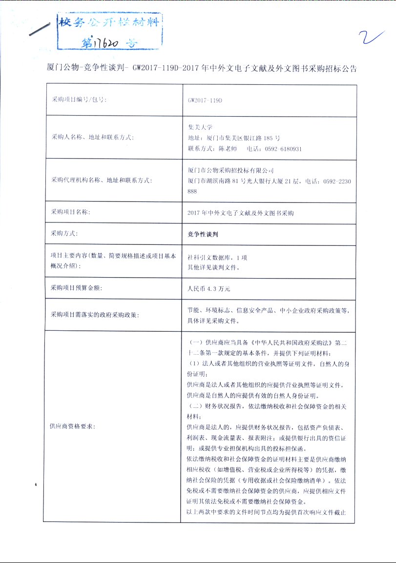 厦门公物-竞争性谈判-GW2017-119D-2017年中外文电子文献及外文图书采购招标公告