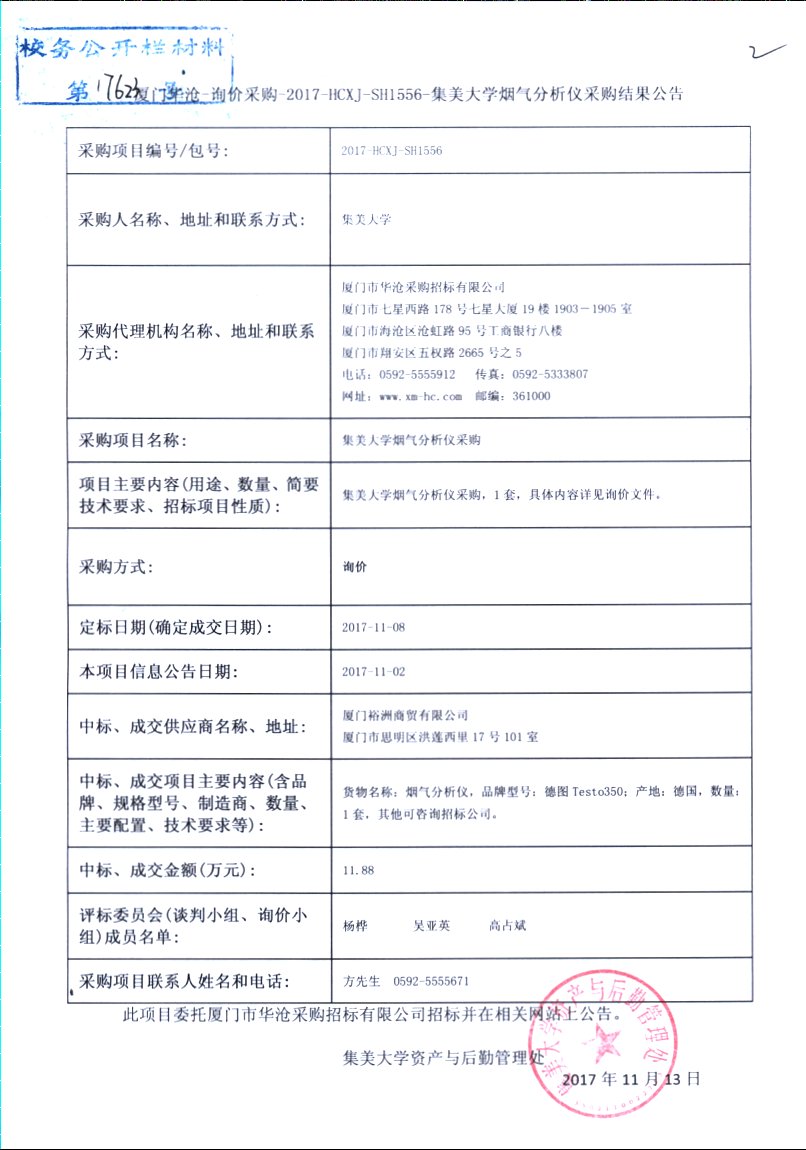 厦门华沧-询价采购-2017-HCXJ-SH1556-集美大学烟气分析仪采购结果公告