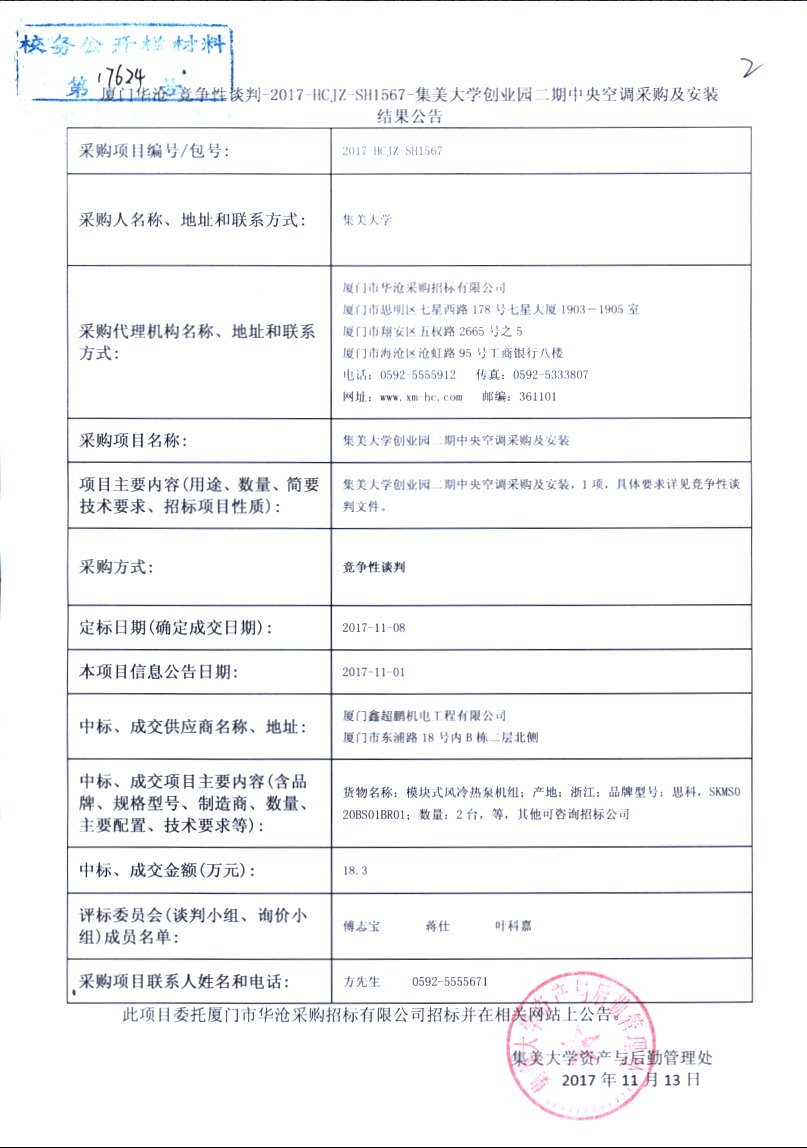 厦门华沧-竞争性谈判-2017-HCJZ-SH1567-集美大学创业园二期中央空调采购及安装结果公告