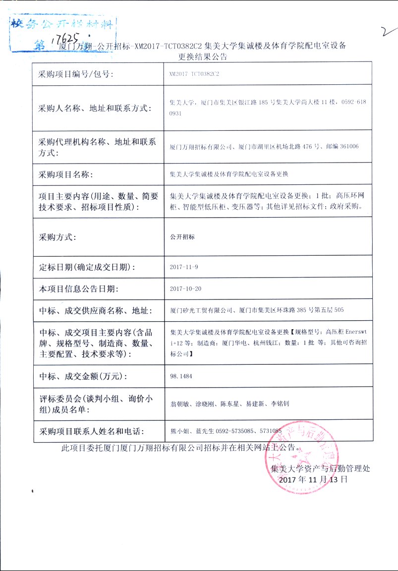 厦门万翔-公开招标-XM2017-TCT0382C2集美大学集诚楼及体育学院配电室设备更换结果公告