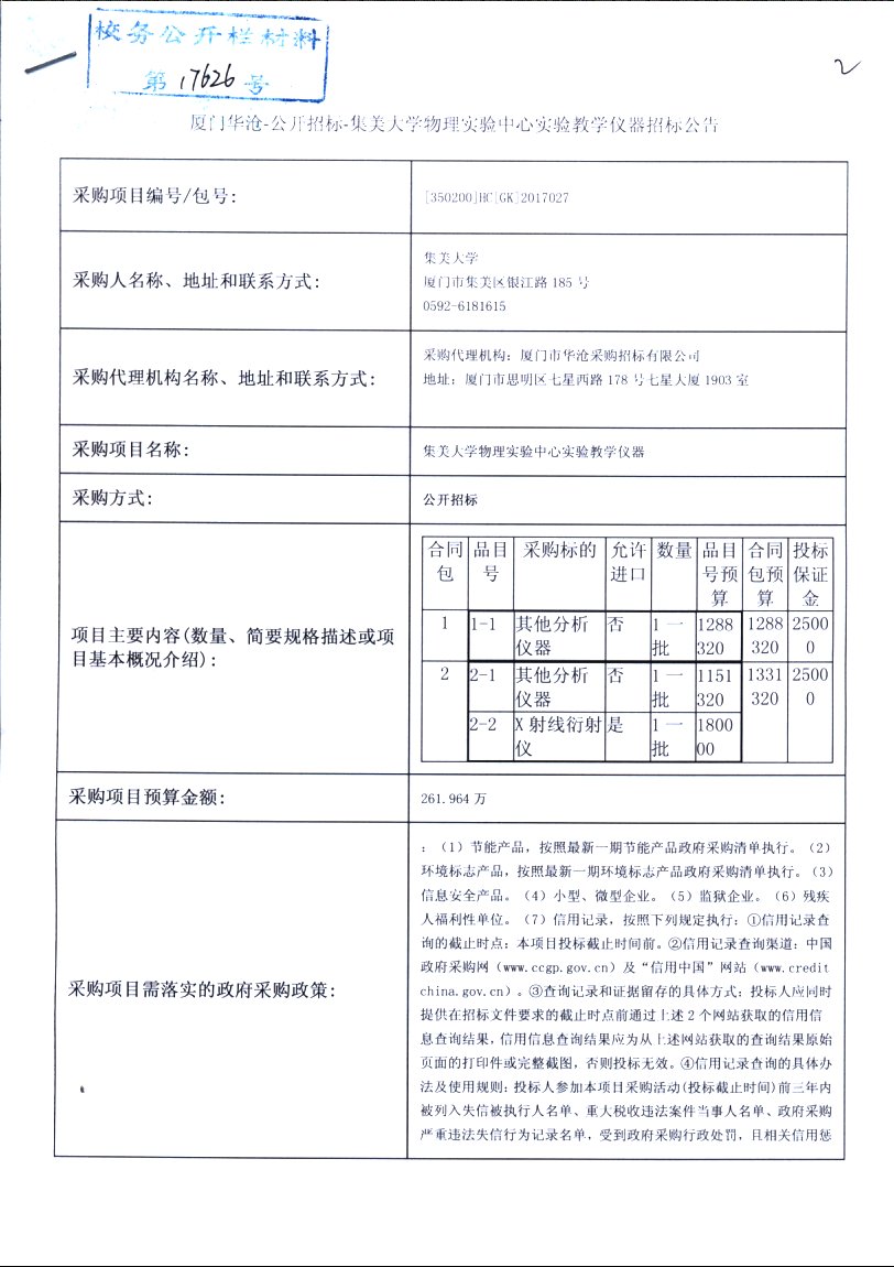 厦门华沧-公开招标-集美大学物理实验中心实验教学仪器招标公告