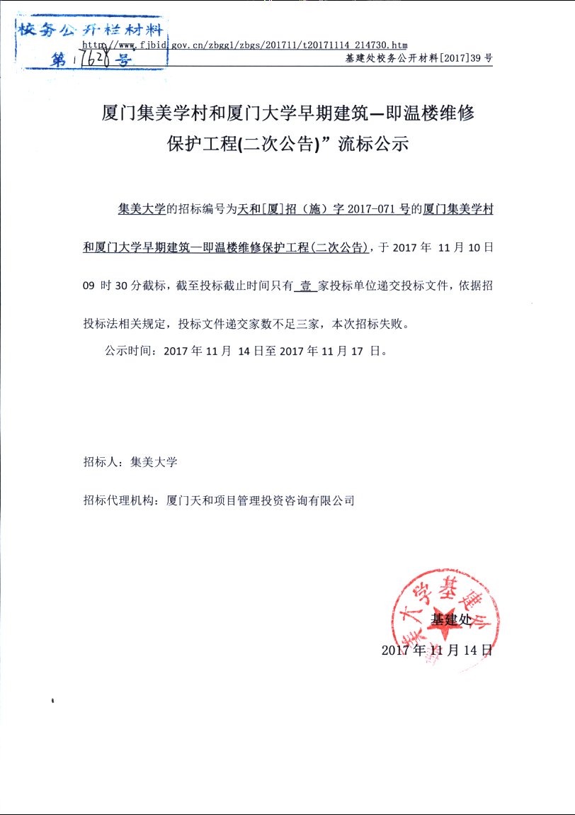 厦门集美学村和厦门大学早期建筑—即温楼维修保护工程(二次公告)流标公示