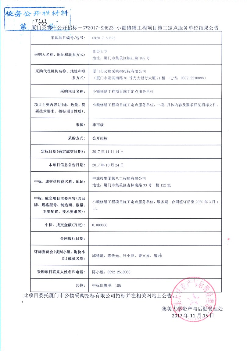 厦门公物-公开招标-GW2017-SH623-小额修缮工程项目施工定点服务单位结果公告