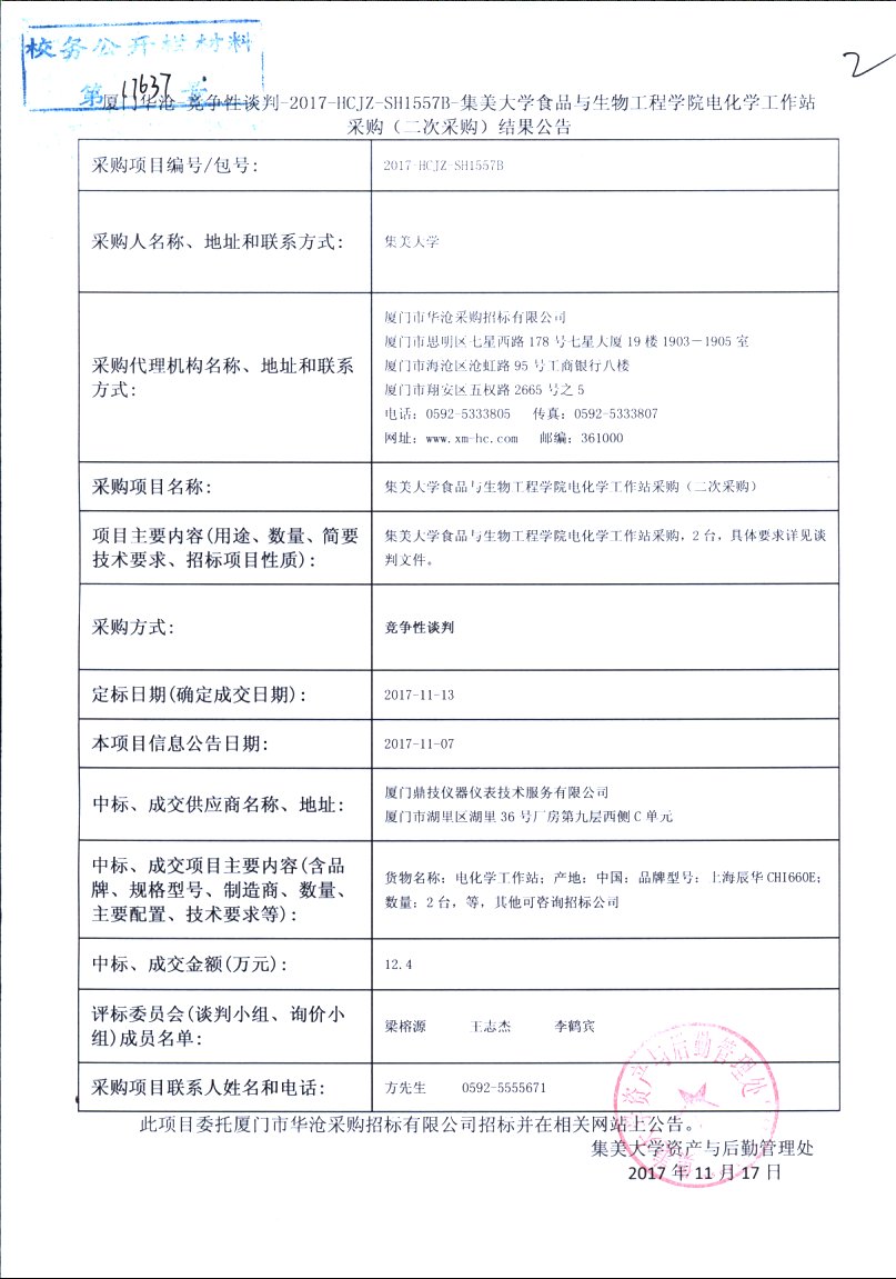 厦门华沧-竞争性谈判-2017-HCJZ-SH1557B-集美大学食品与生物工程学院电化学工作站采购(二次采购)结果公告