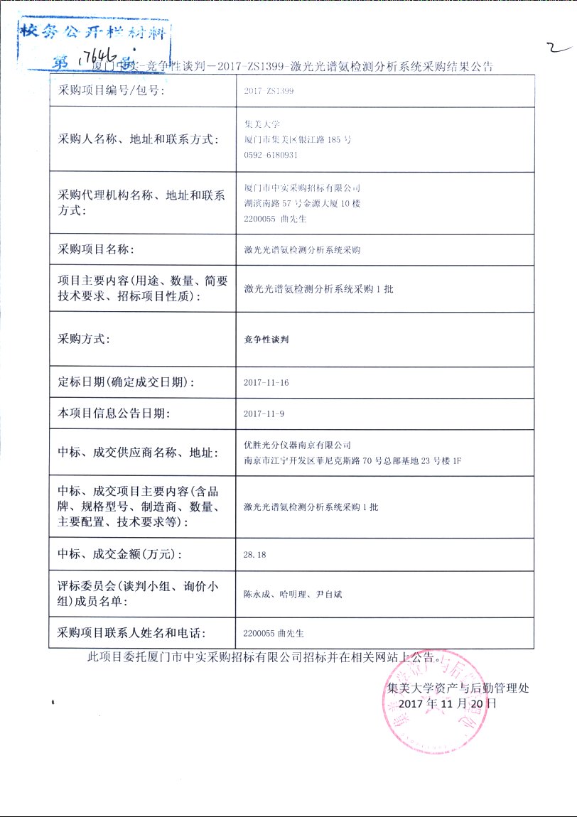 厦门中实-竞争性谈判-2017-ZS1399-激光光谱氨检测分析系统采购结果公告