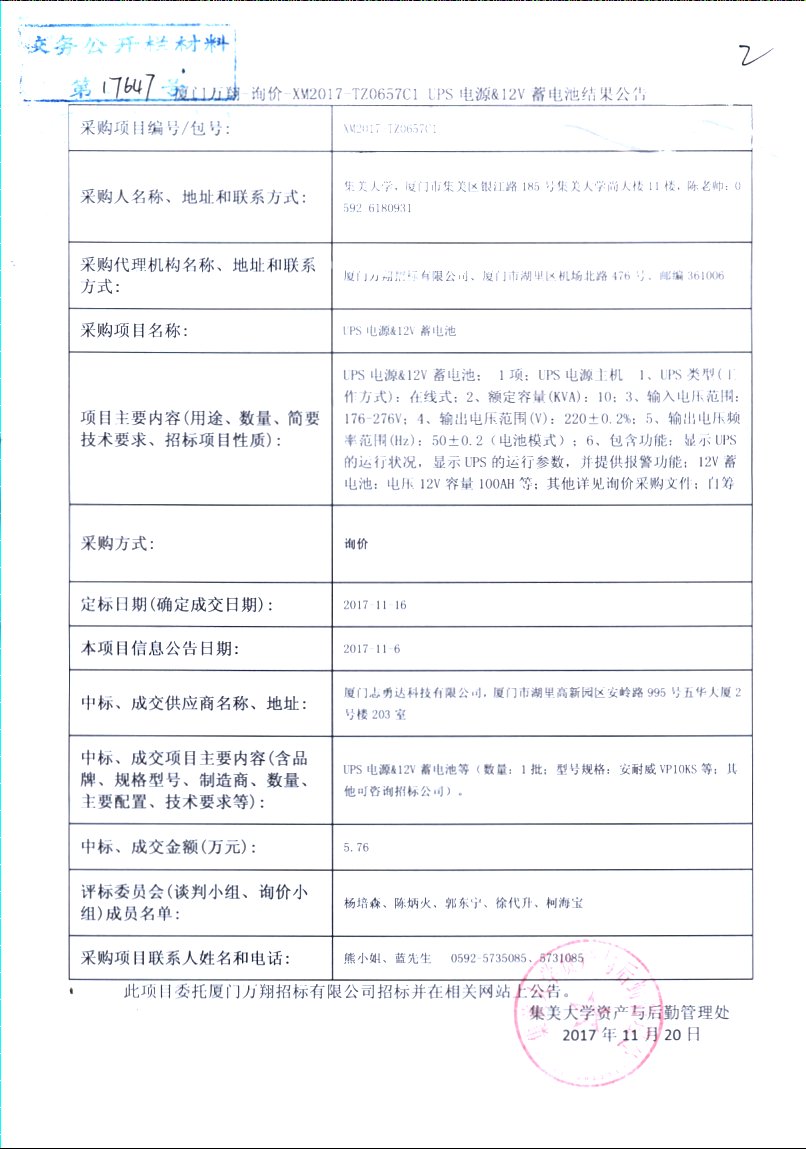 厦门万翔-询价-XM2017-TZ0657C1 UPS电源&12V蓄电池结果公告