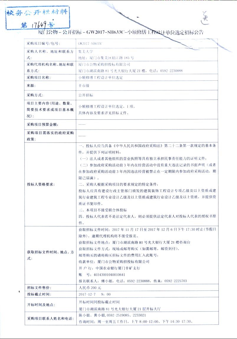 厦门公物-公开招标-GW2017-SH633C-小额修缮工程设计单位选定招标公告