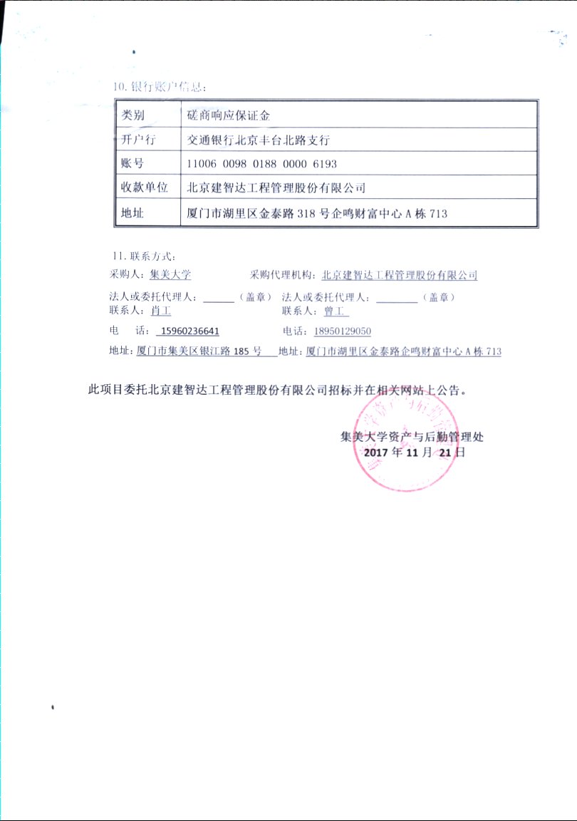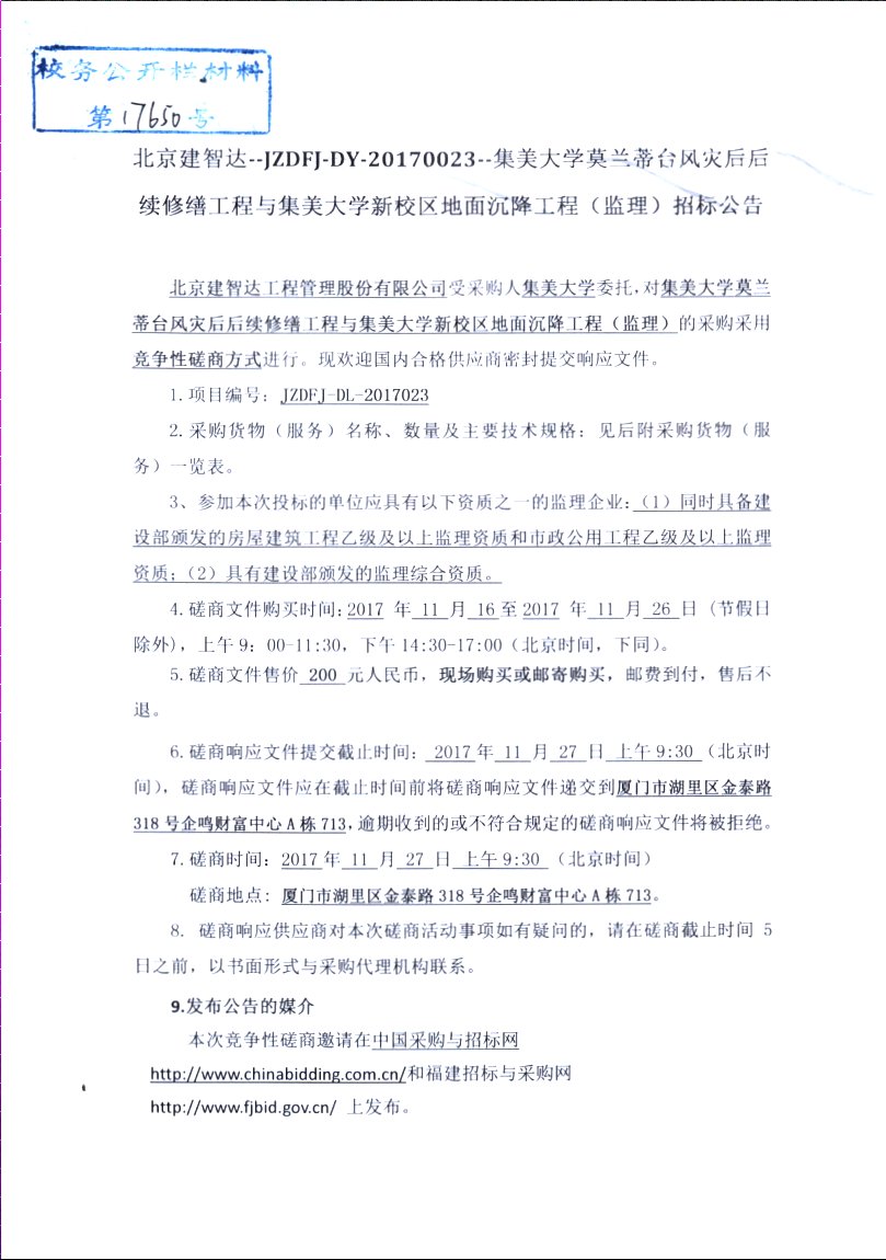 北京建智达——JZDFJ—DY—20170023——集美大学莫兰蒂台风后后续修缮工程与集美大学新校区地面沉降工程(监理)招标公告
