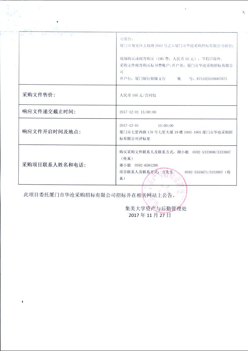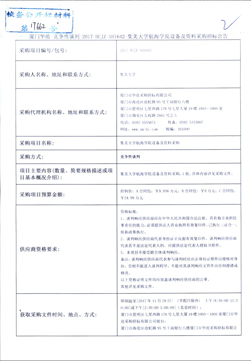 厦门华沧-竞争性谈判-2017-HCJZ-SH1642-集美大学航海学院设备及资料采购招标公告