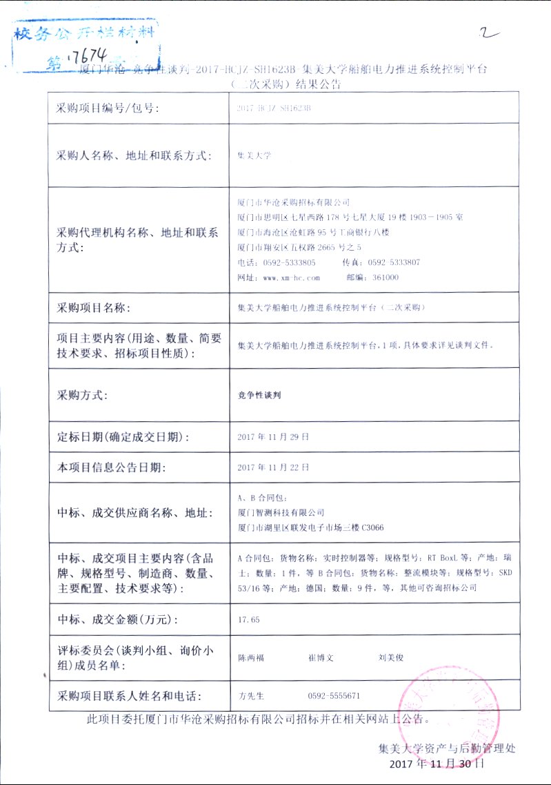 厦门华沧-竞争性谈判-2017-HCJZ-SH1623B-集美大学船舶电力推进系统控制平台(二次采购)结果公告