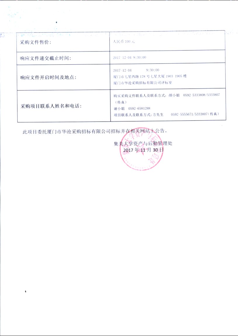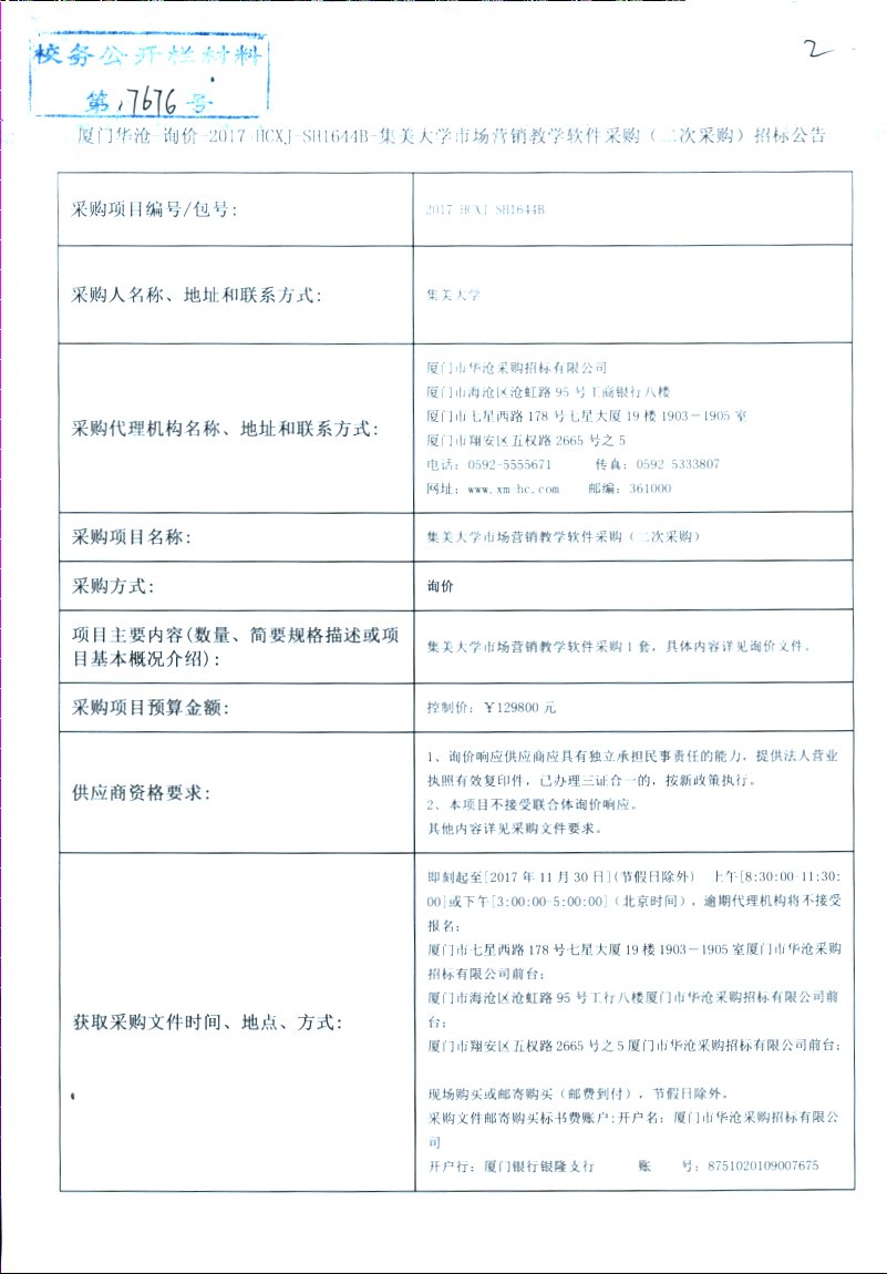 厦门华沧-询价-2017-HCXJ-SH1644B-集美大学市场营销教学软件采购(二次采购)招标公告