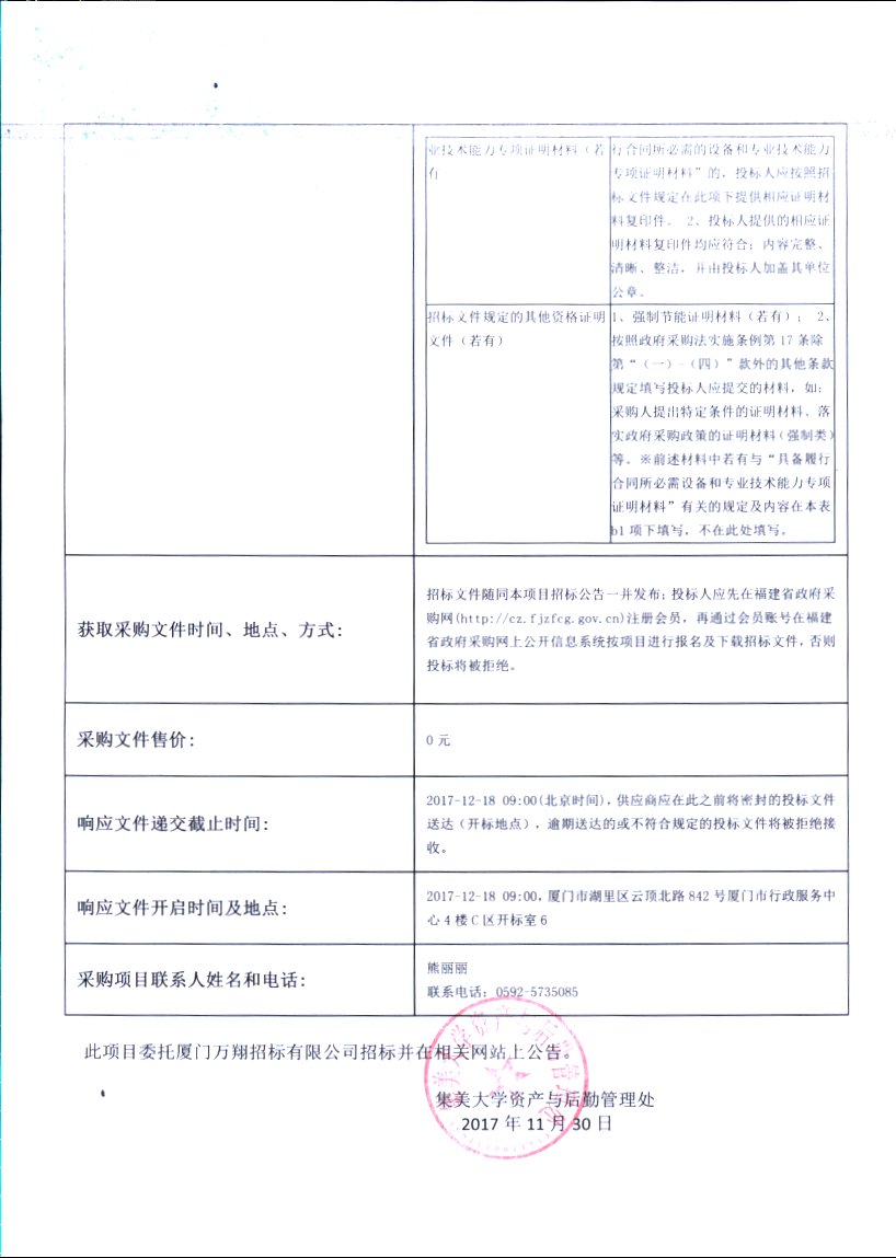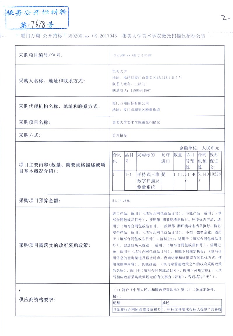 厦门万翔-公开招标-[350200]wx[GK]2017048-集美大学美术学院激光扫描仪招标公告