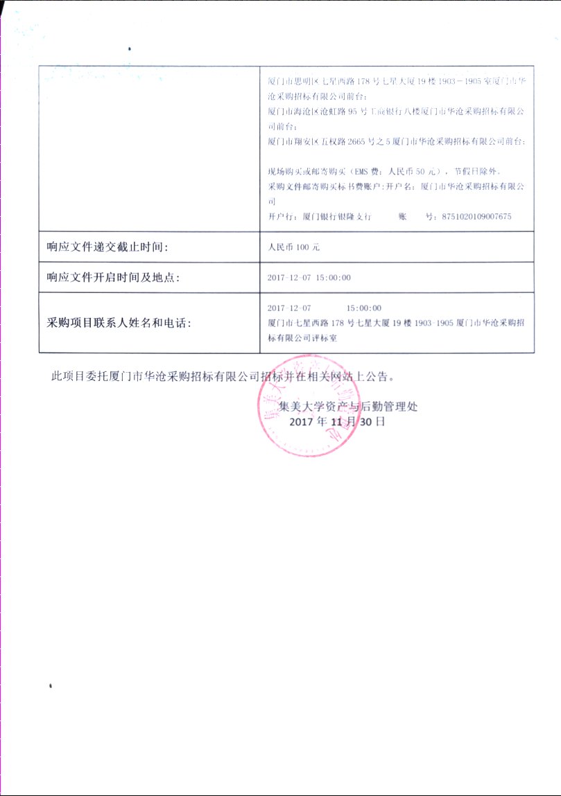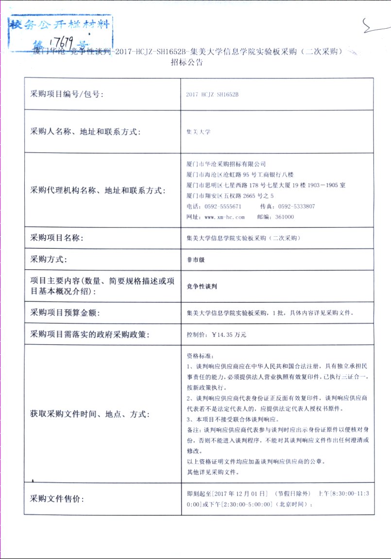 厦门华沧-竞争性谈判-2017-HCJZ-SH1652B-集美大学信息学院实验板采购(二次采购)招标公告