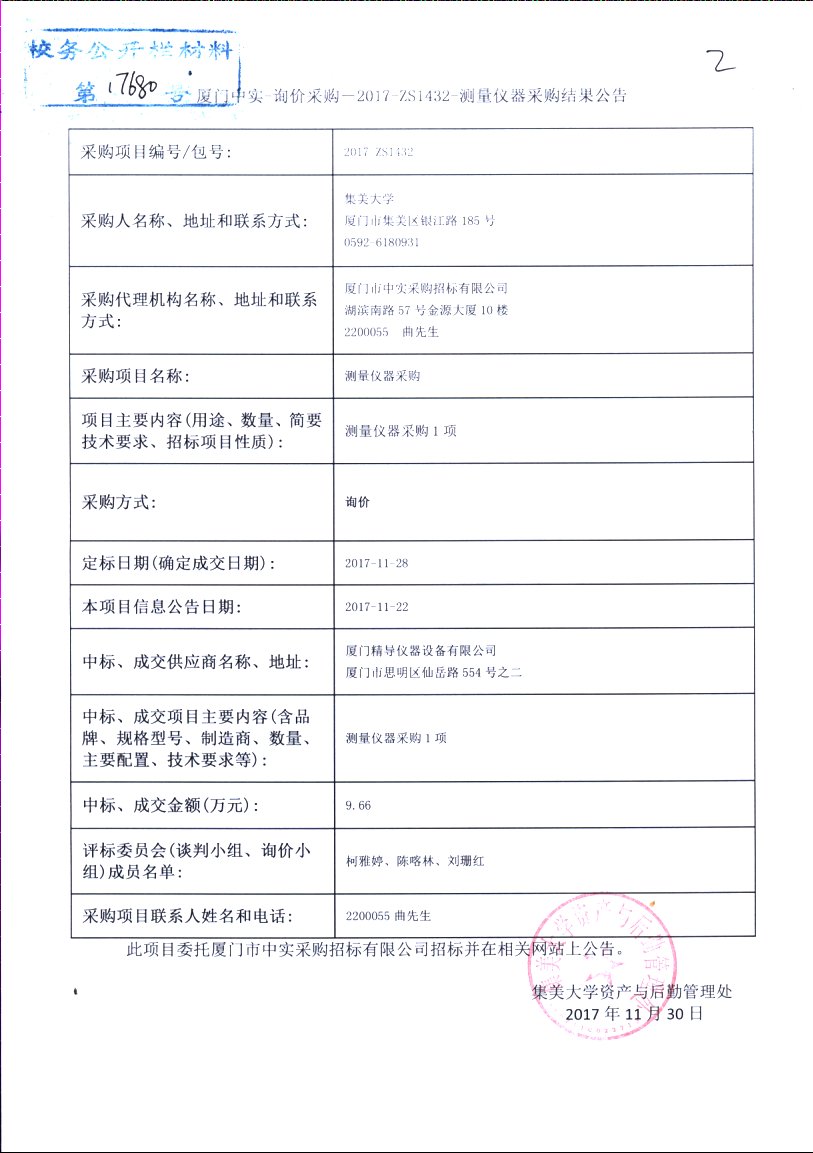 厦门中实-询价采购-2017-ZS1432-测量仪器采购结果公告