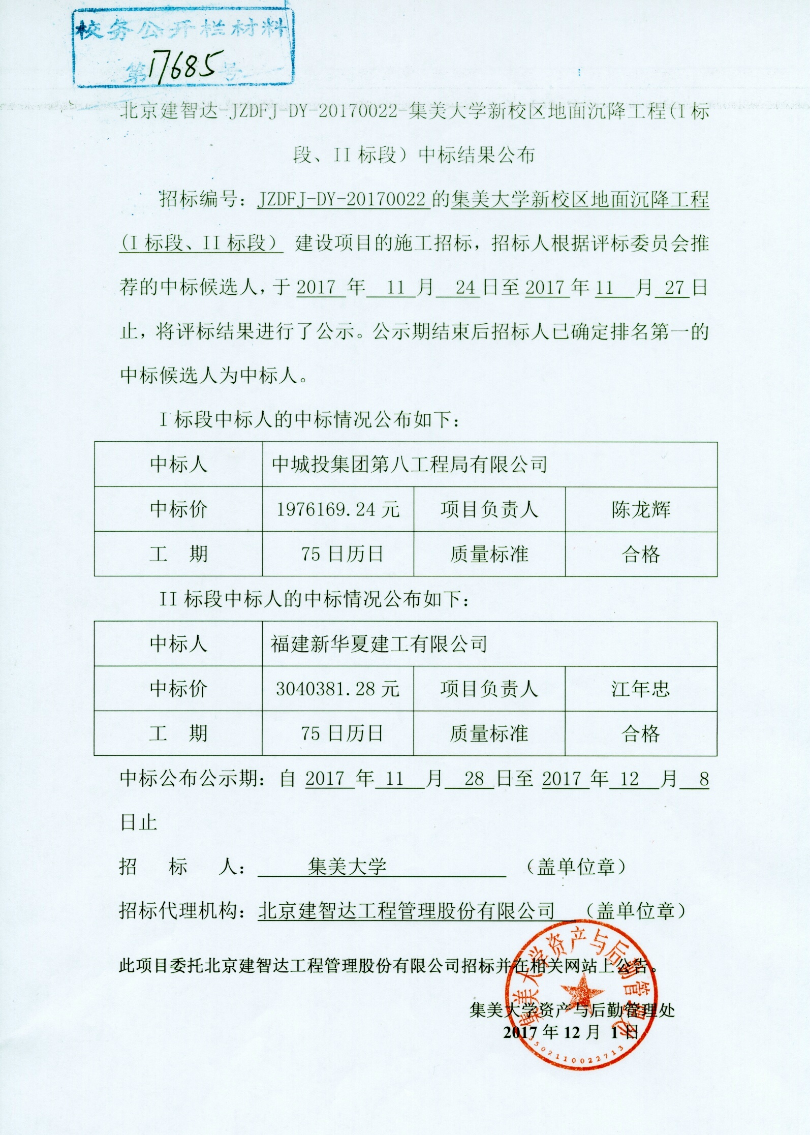 北京建智达—JZDFJ-DY-20170022-集美大学新校区地面沉降工程(I标段、II标段)中标结果公布