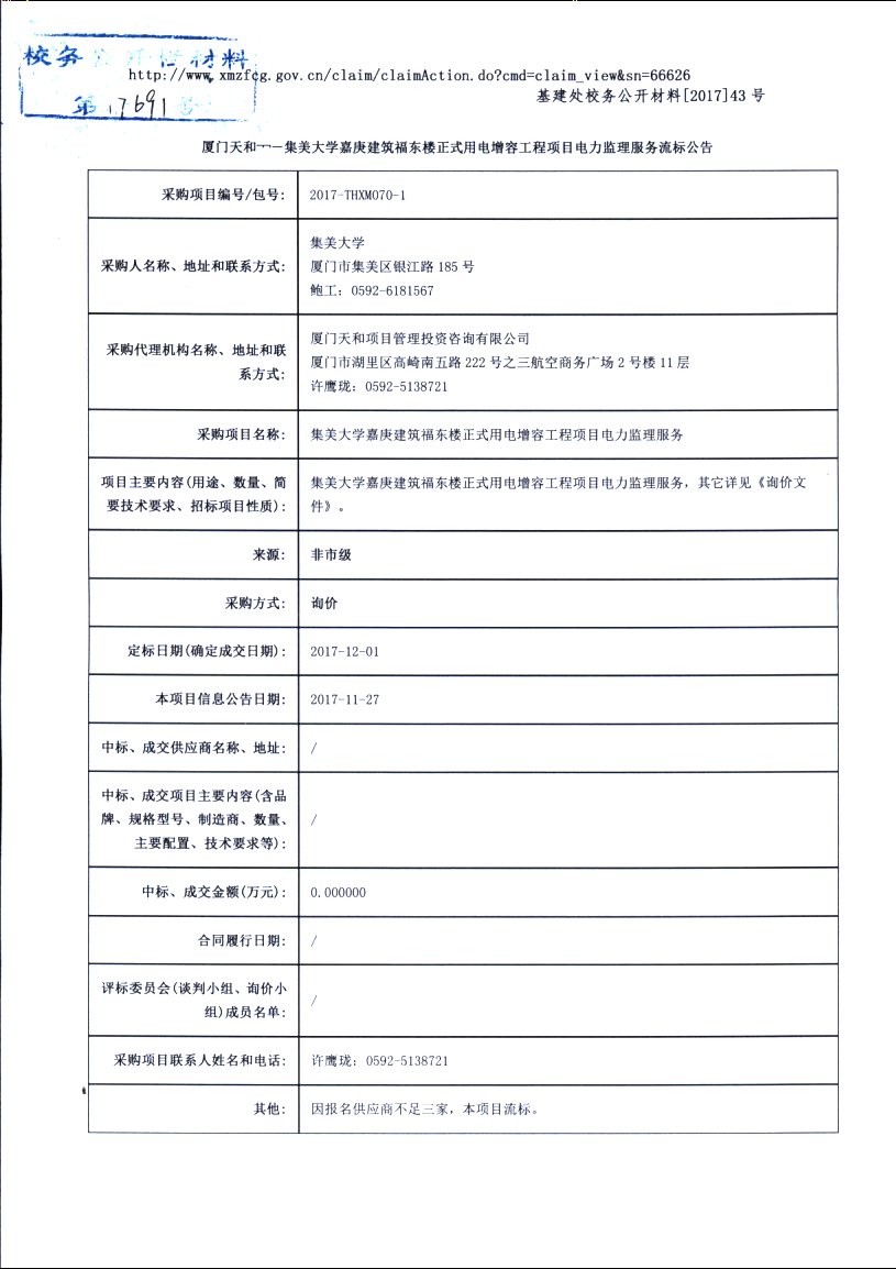厦门天和——集美大学嘉庚建筑福东楼正式用电增容工程项目电力监理服务流标公告