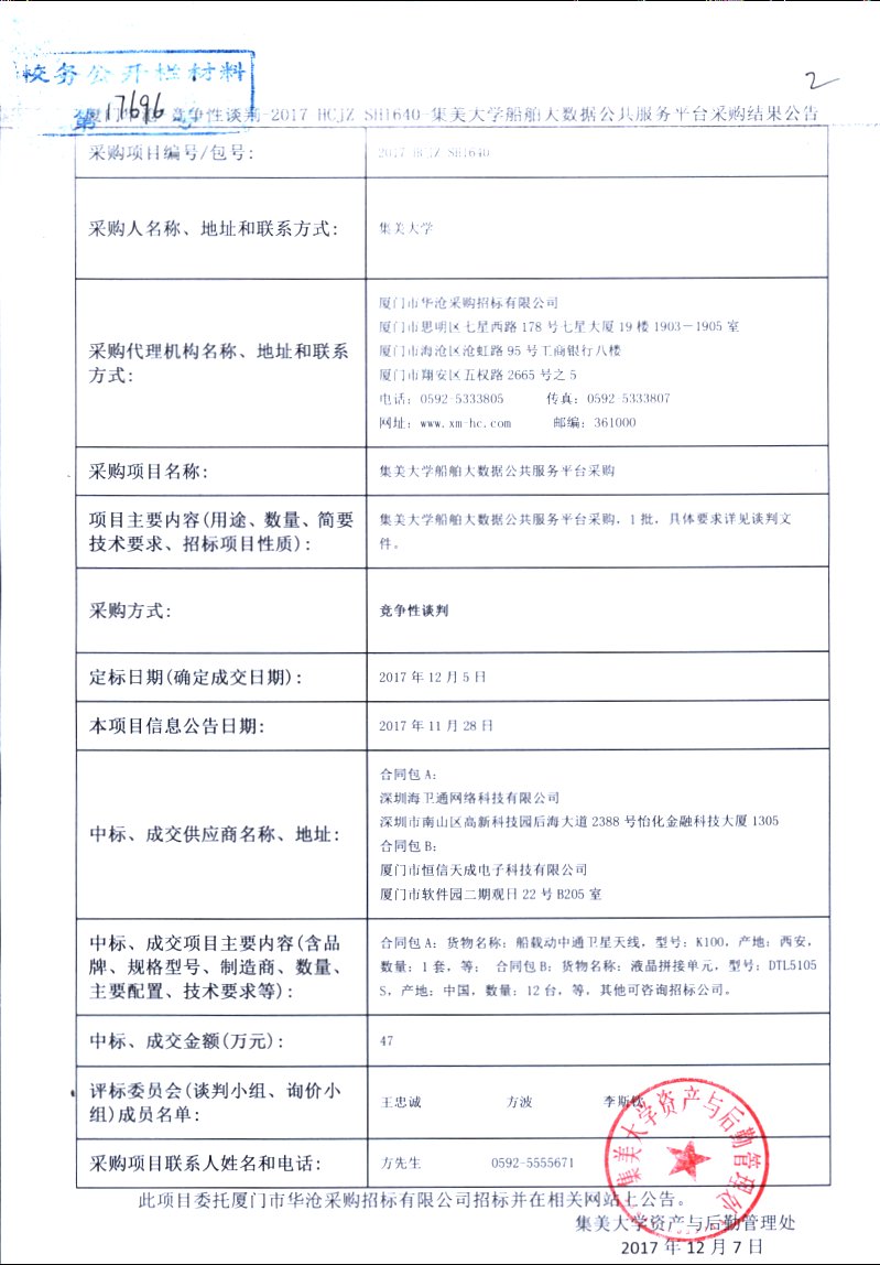 厦门华沧-竞争性谈判-2017-HCJZ-SH1640-集美大学船舶大数据公共服务平台采购结果公告