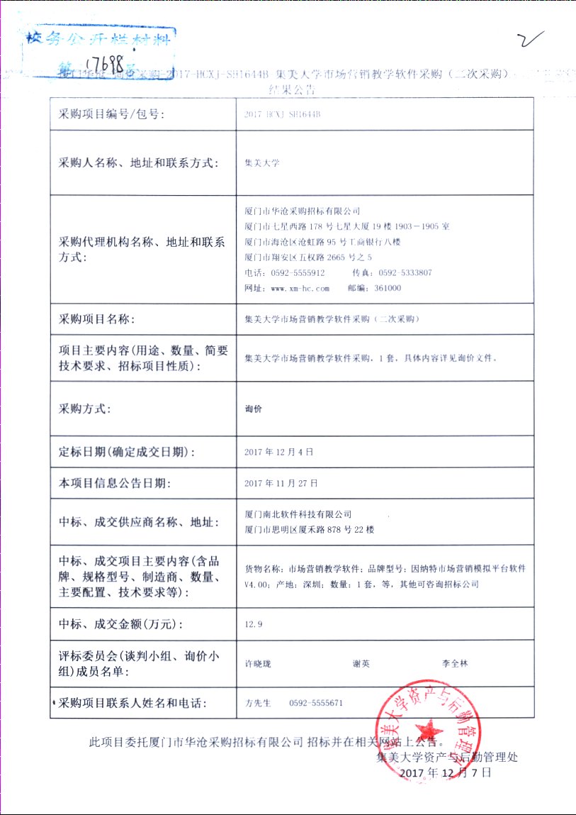 厦门华沧-询价采购-2017-HCXJ-SH1644B-集美大学市场营销教学软件采购(二次采购)结果公告