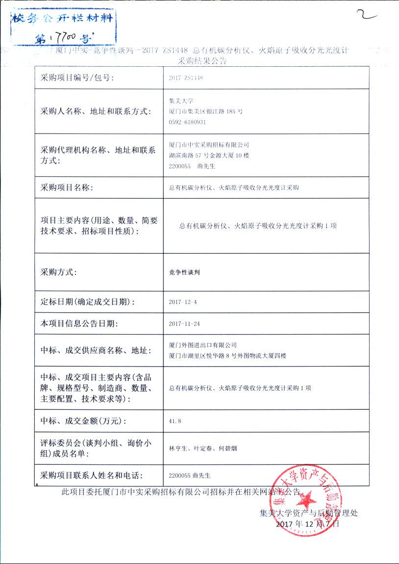 厦门中实-竞争性谈判-2017-ZST448-总有机碳分析仪、火焰原子吸收分光光度计采购结果公告