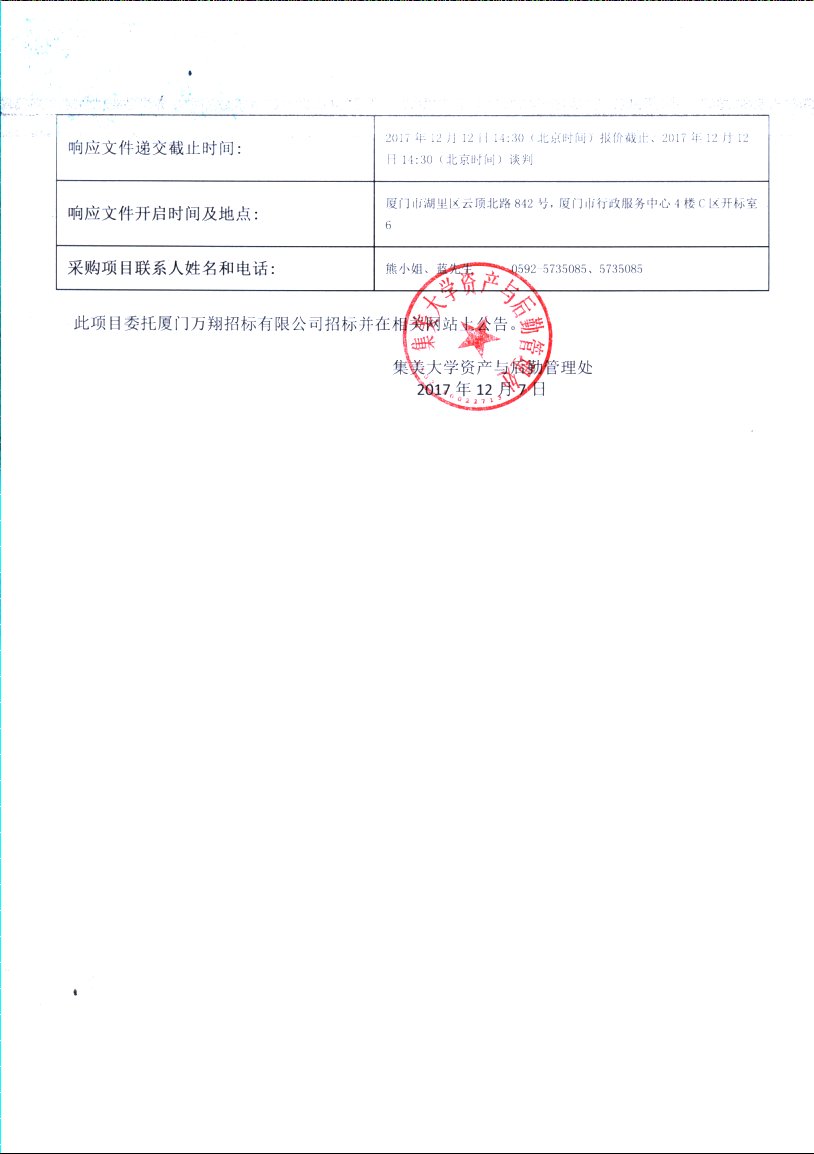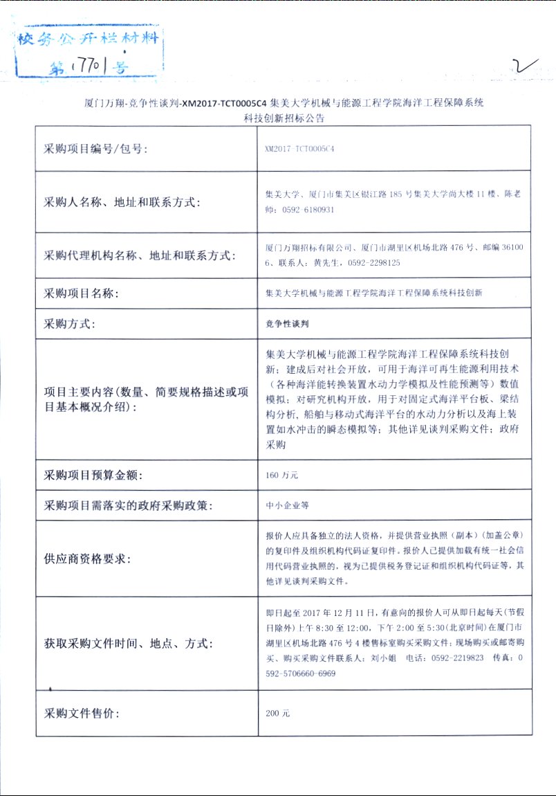 厦门万翔-竞争性谈判-XM2017-TCT0005C4集美大学机械与能源工程学院海洋工程保障系统科技创新招标公告