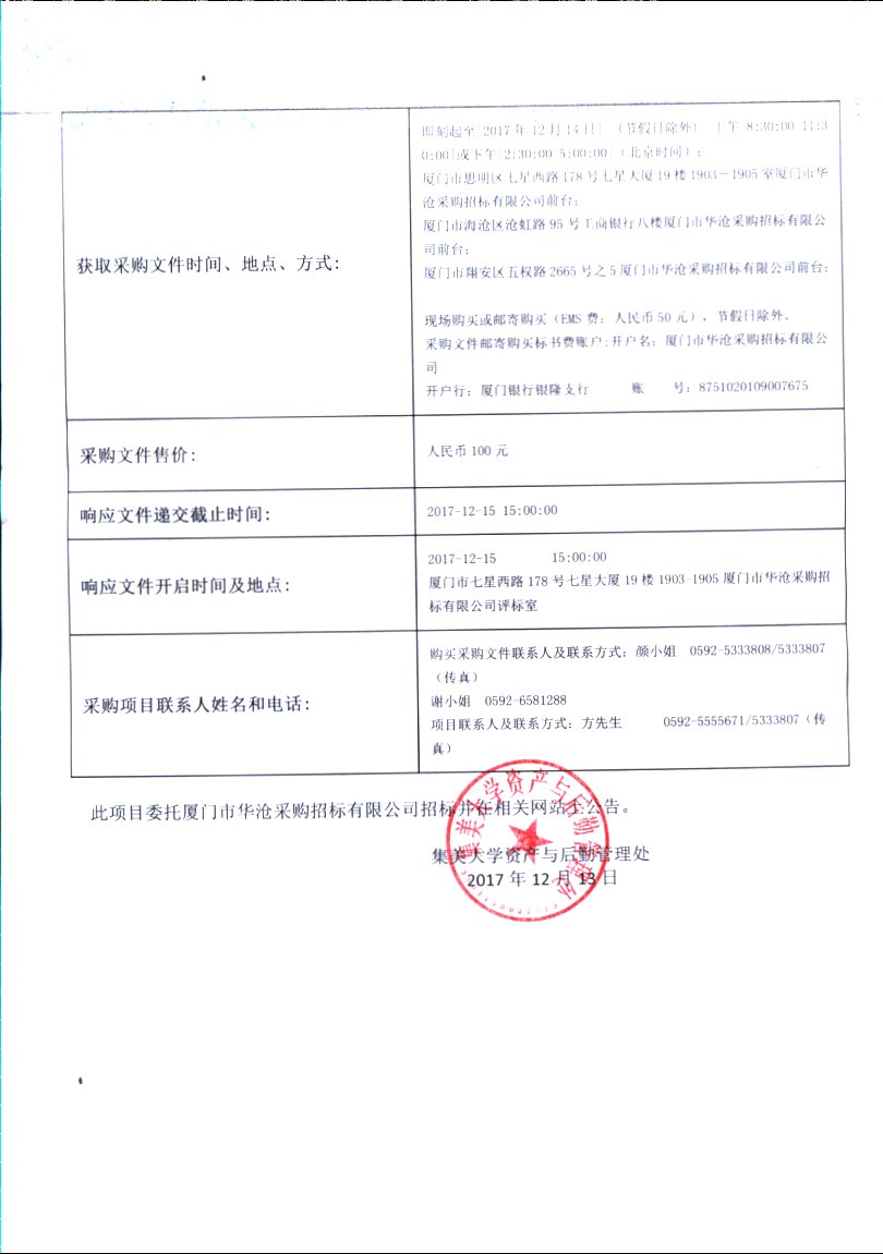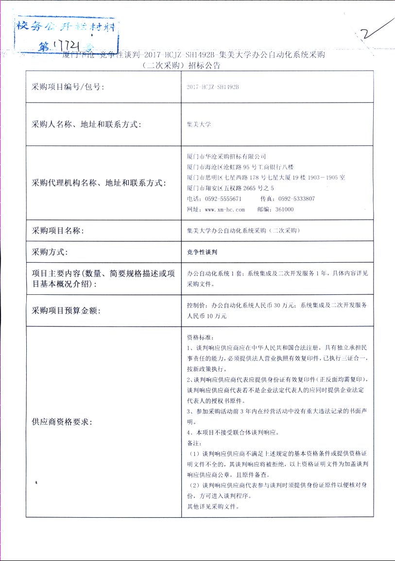厦门华沧-竞争性谈判-2017-HCJZ-SH14292B-集美大学办公自动化系统采购(二次采购)招标公告