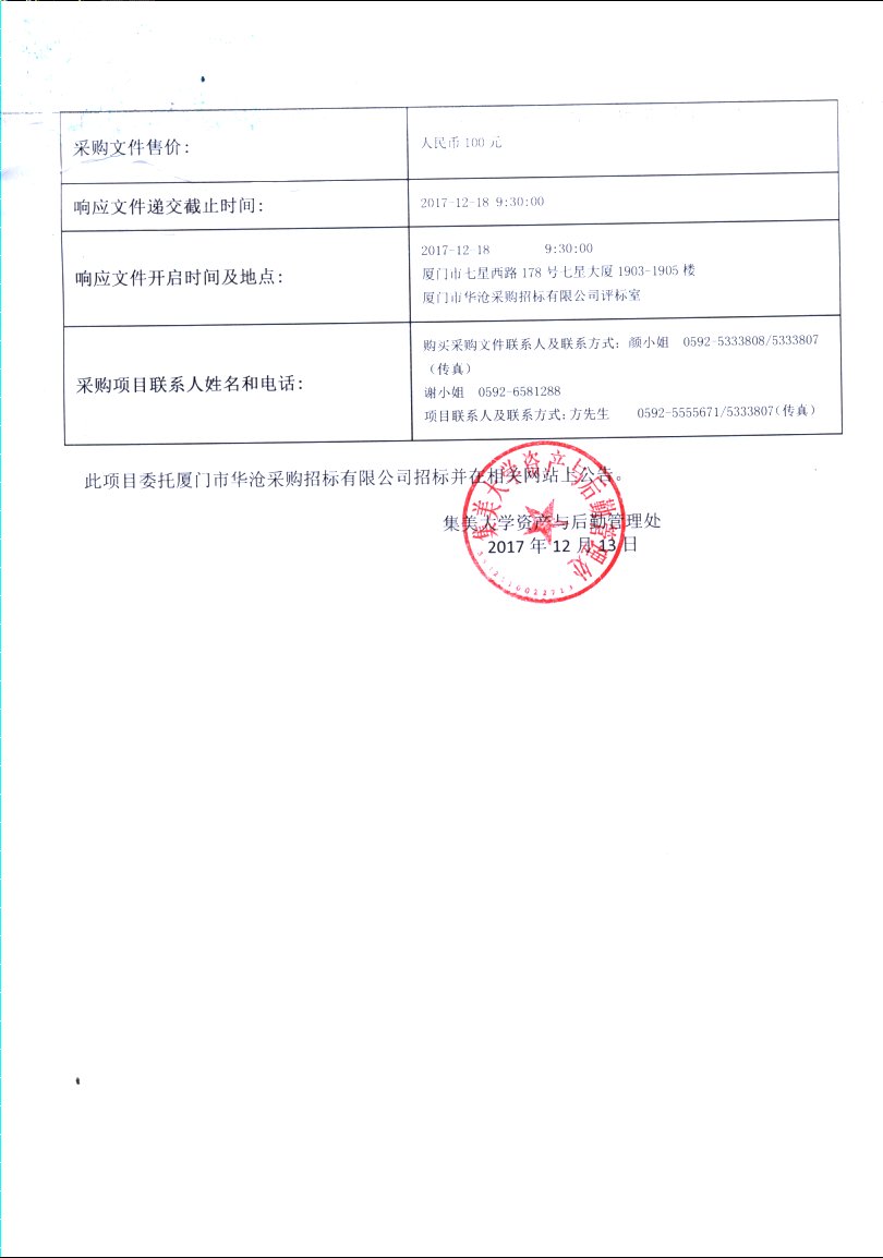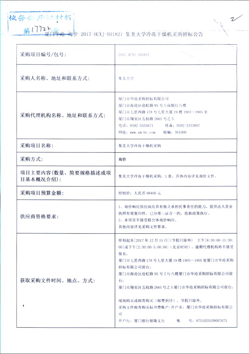 厦门华沧-询价-2017-HCXJ-SH1821-集美大学冷冻干燥机采购招标公告