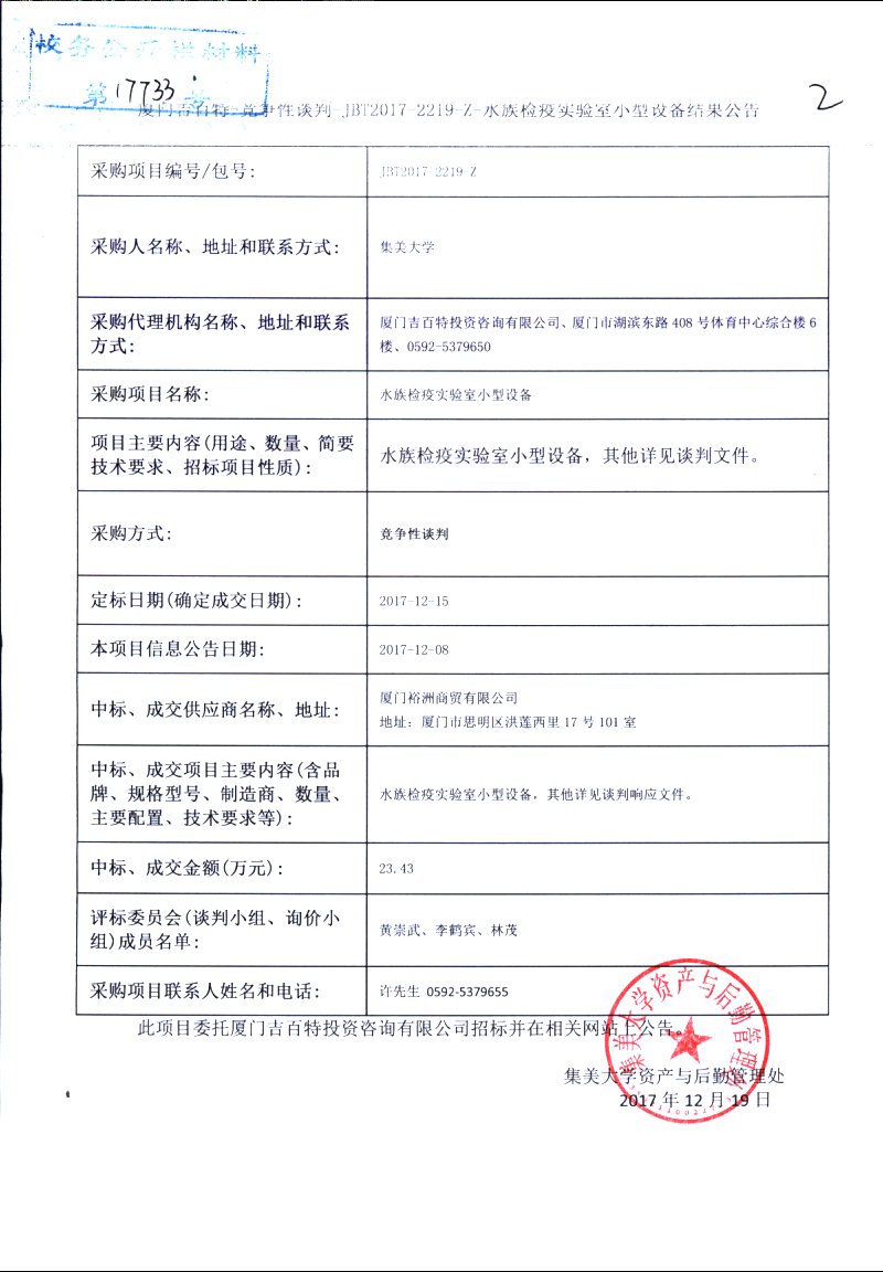 厦门吉百特-竞争性谈判-JBT2017-2219-Z-水族检疫实验室小型设备结果公告