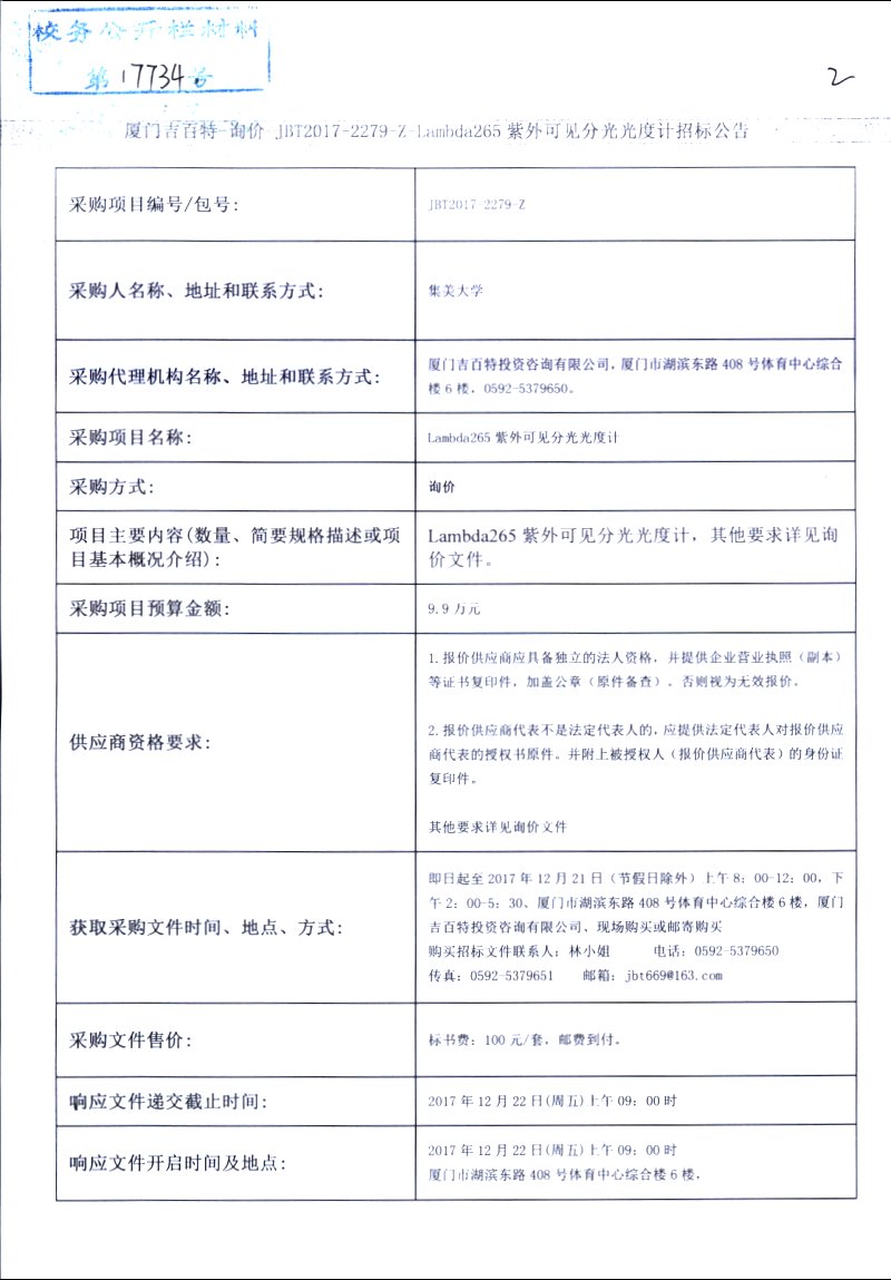 厦门吉百特-询价-JBT2017-2279-Z-Lambda265紫外可见分光光度计招标公告
