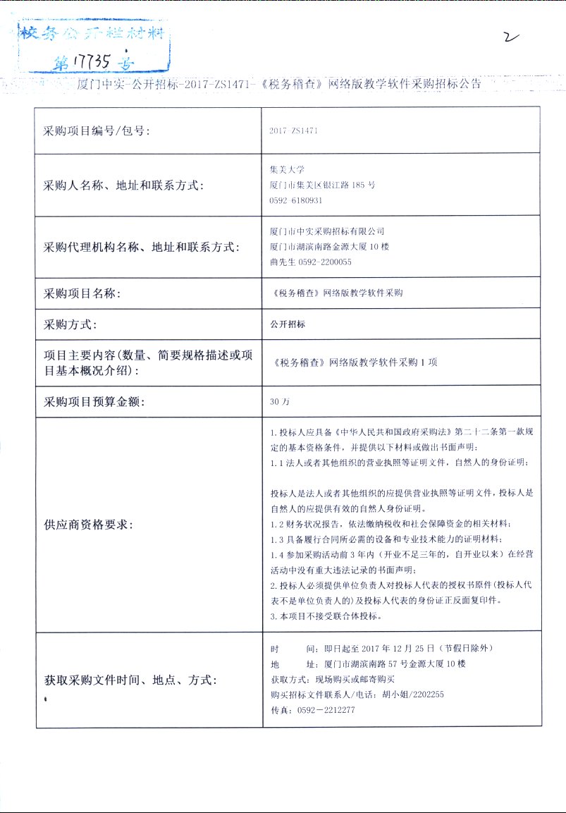 厦门中实-公开招标-2017-ZS1471-《税务稽查》网络版教学软件采购招标公告