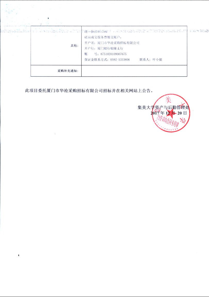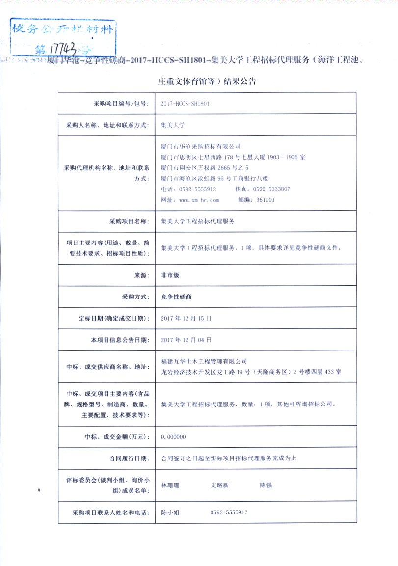厦门华沧-竞争性磋商-2017-HCCS-SH1801-集美大学工程招标代理服务(海洋工程池、庄重文体育馆等)结果公告