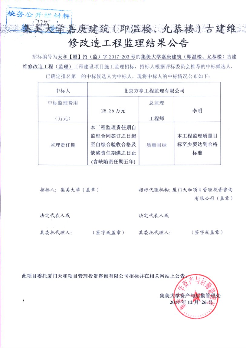 集美大学嘉庚建筑(即温楼、允恭楼)古建维修改造工程监理结果公告