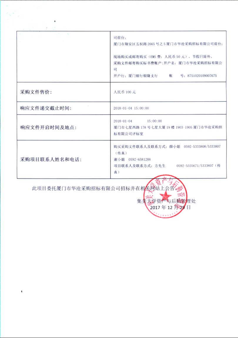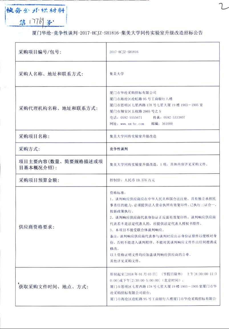 厦门华沧-竞争性谈判-2017-HCJZ-SH1816-集美大学同传实验室升级改造招标公告