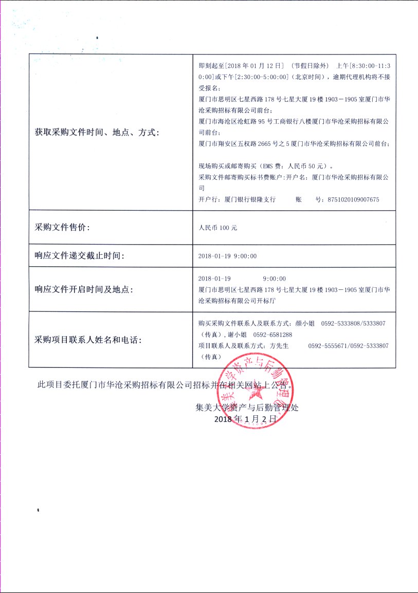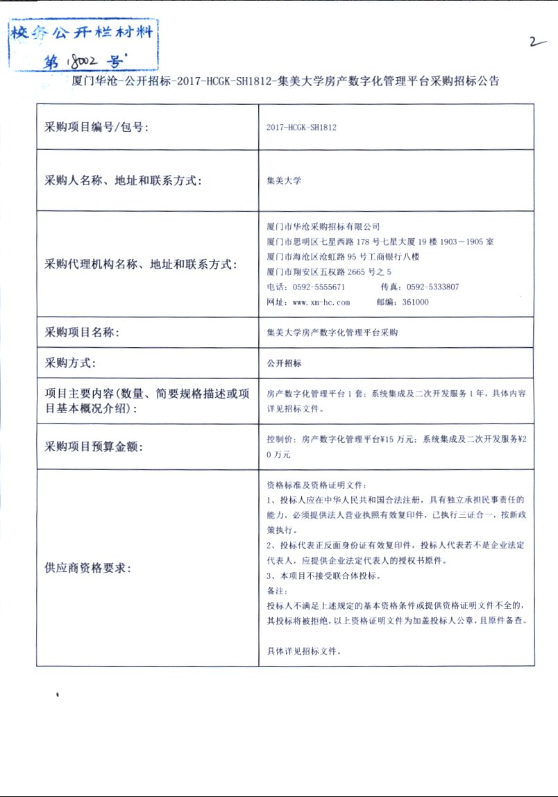 厦门华沧-公开招标-2017-HCGK-SH1812-集美大学房产数字化管理平台采购招标公告