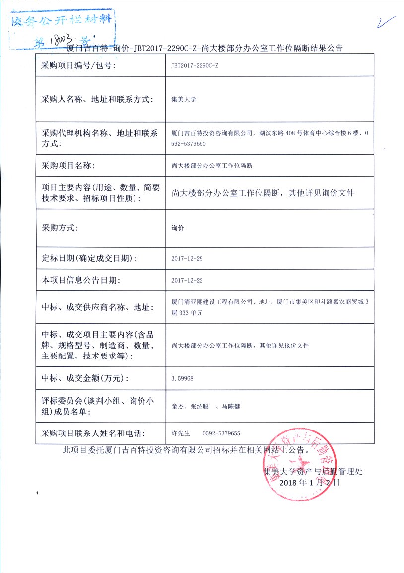 厦门吉百特-询价-JBT2017-2290C-Z-尚大楼部分办公室工作位隔断结果公告