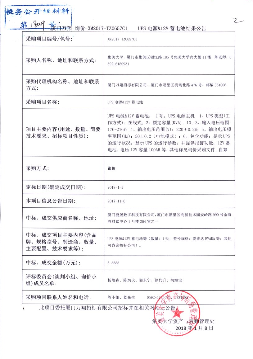 厦门万翔-询价-XM2017-TZ0657C UPS电源&12V蓄电池结果公告