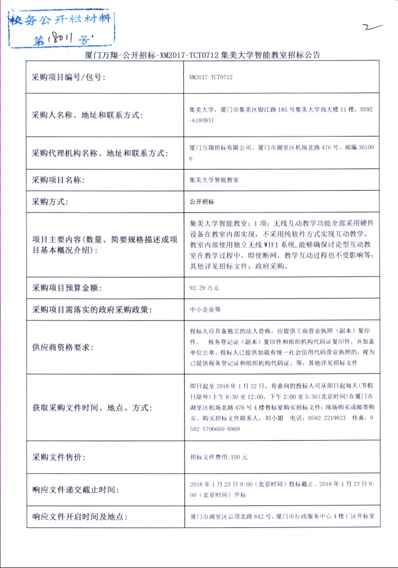 厦门万翔-公开招标-XM2017-TCT0712集美大学智能教室招标公告