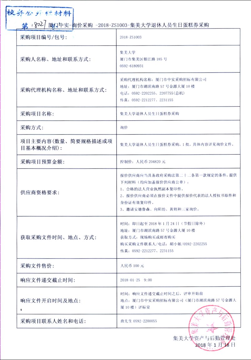 厦门中实-询价采购-2018-ZS1003-集美大学退休人员生日蛋糕券采购