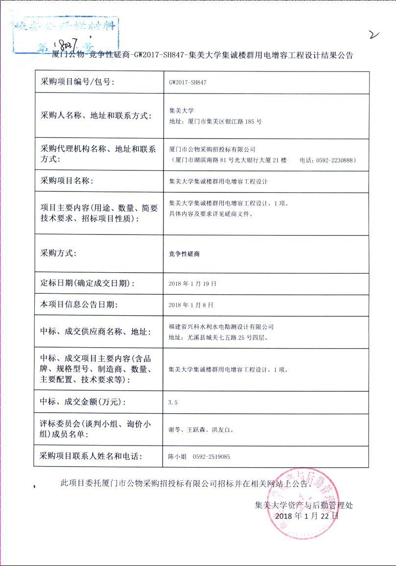 厦门公物-竞争性磋商-GW2017-SH847-集美大学集诚楼群用电增容工程设计结果公告