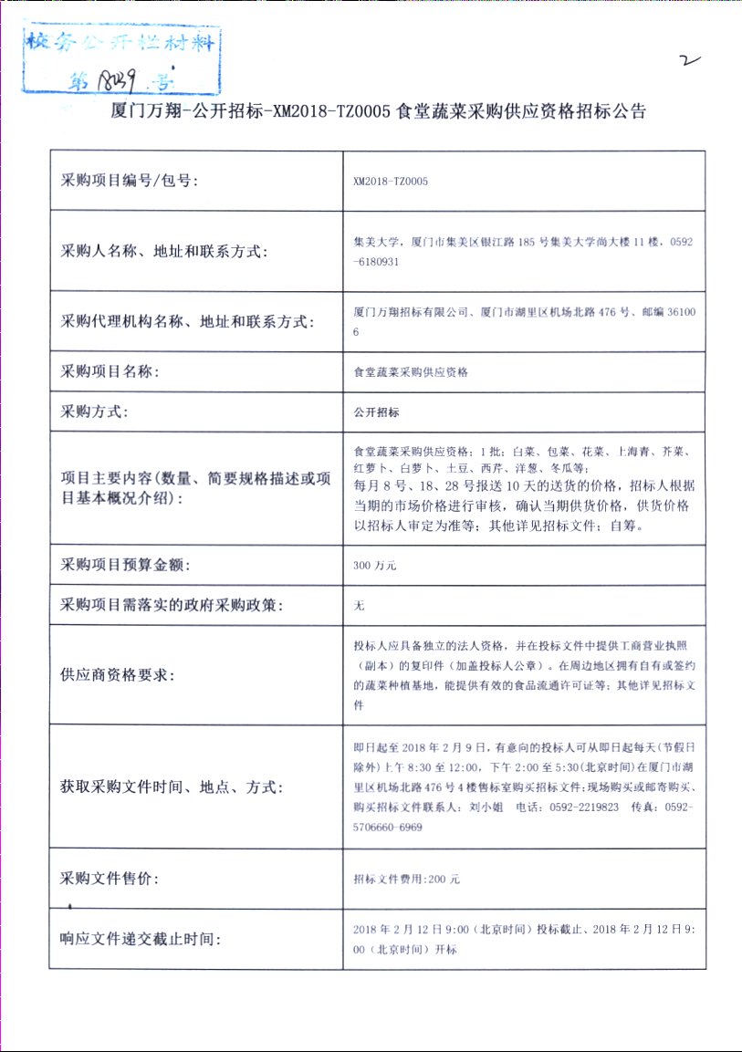 厦门万翔-公开招标-XM2018-TZ0005食堂蔬菜采购供应资格招标公告