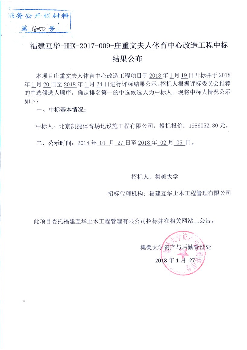 福建互华—HHX—2017—009—庄重文夫人体育中心改造工程中标结果公布