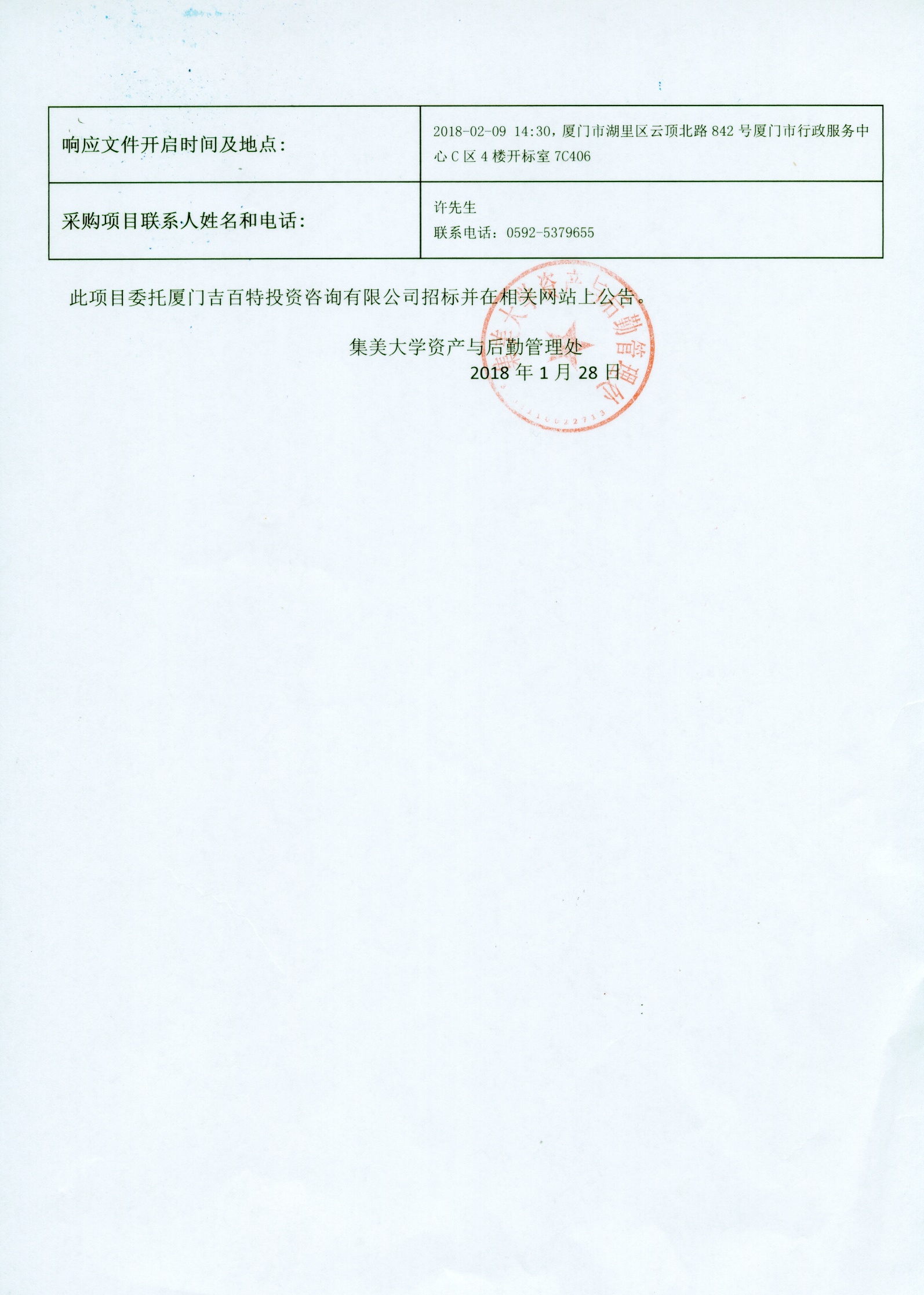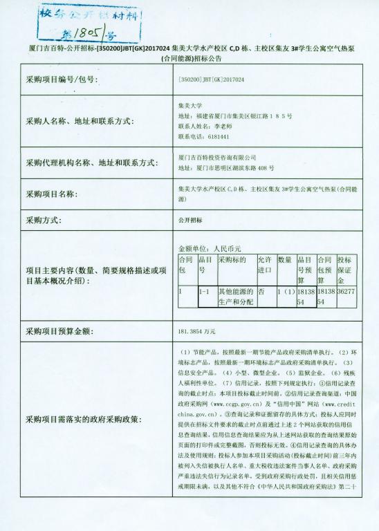 厦门吉百特—公开招标—(350200)JBT(GK)2017024集美大学水产校区C\D栋、主校区集友3#学生公寓空气热泵(合同能源)招标公告