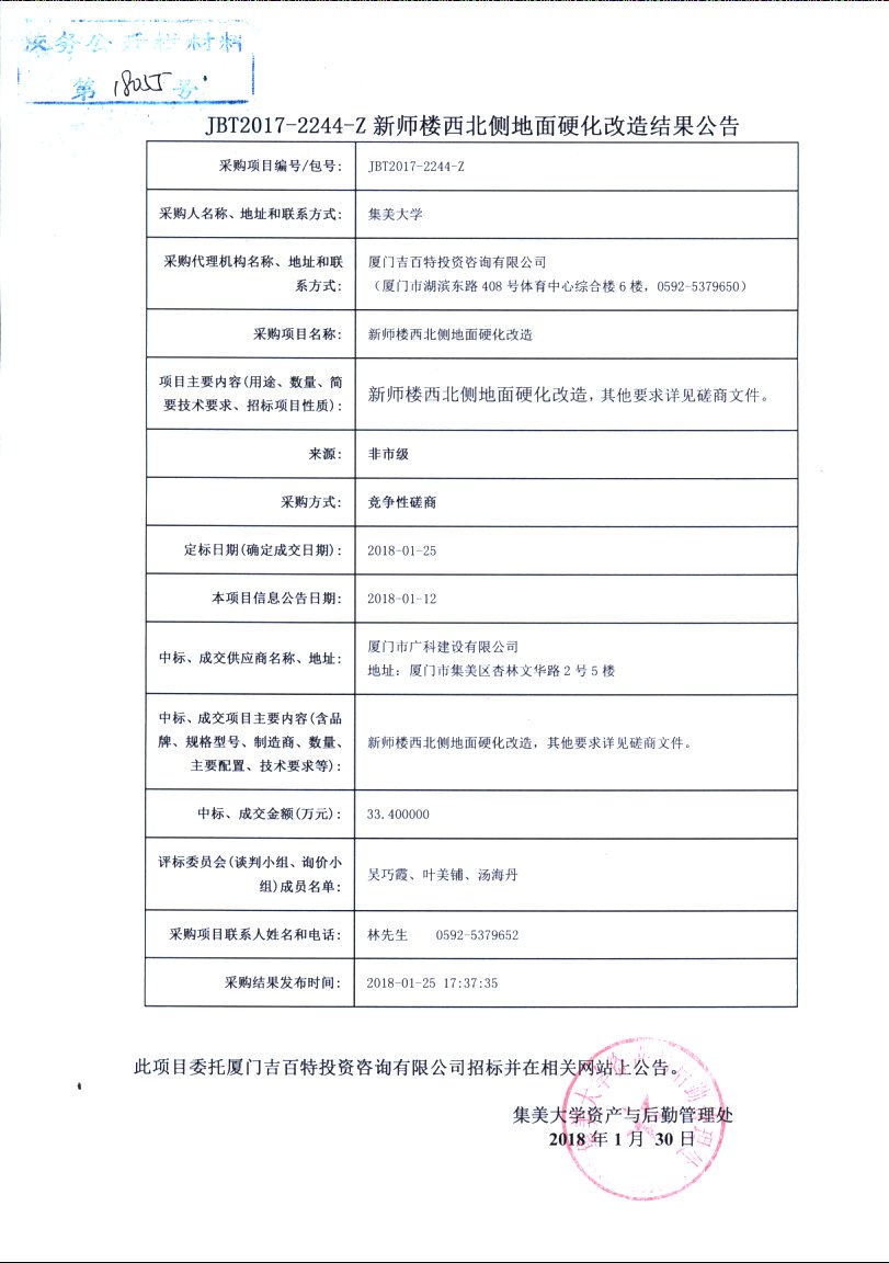JBT2017-2244-Z-新师楼西北侧地面硬化改造结果公告