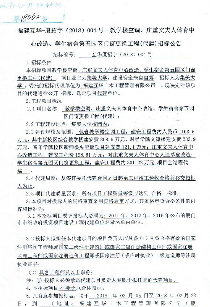 教学楼空调、庄重文夫人体育中心改造、学生宿舍第五园区门窗更换工程(代建)招标公告