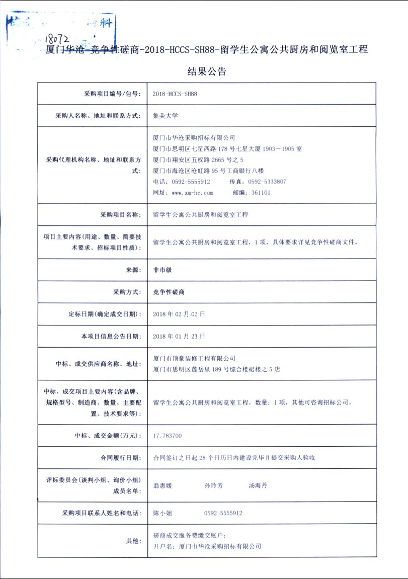 厦门华沧-竞争性磋商-2018-HCCS-SH88-留学生公寓公共厨房和阅览室工程结果公告