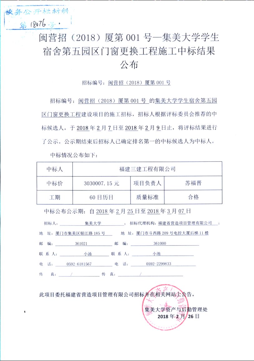 闽营招(2018)厦第001号—集美大学学生宿舍第五园区门窗更换工程施工中标结果公布