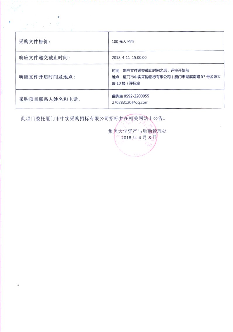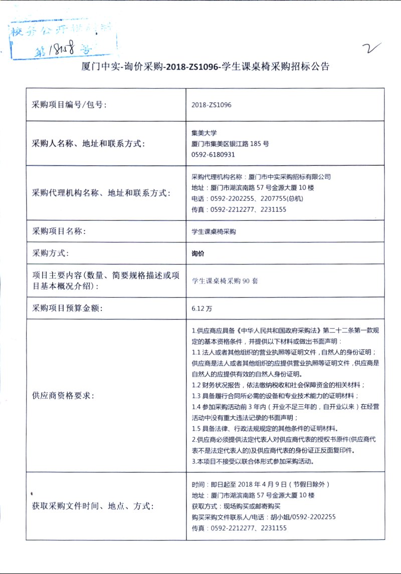 厦门中实—询价采购—2018—ZS1096—学生课桌椅采购招标公告