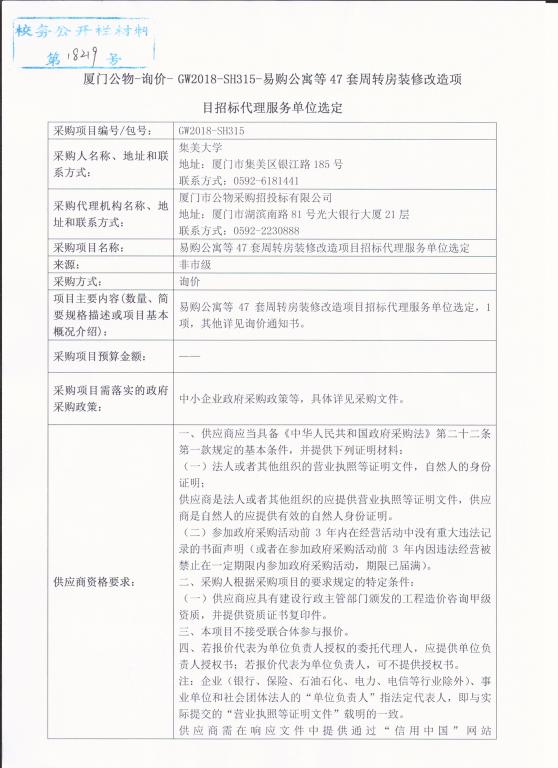 厦门公物—询价—GW2018—SH315—易购公寓等47套周转房装修改造项目招标代理服务单位选定