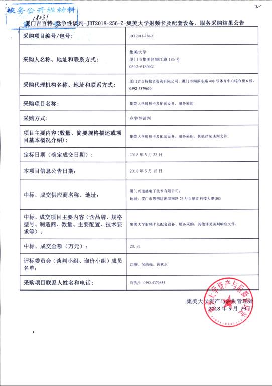 厦门吉百特—竞争性谈判—JBT2018—256—Z-集美大学射频卡及配套设备、服务采购结果公告