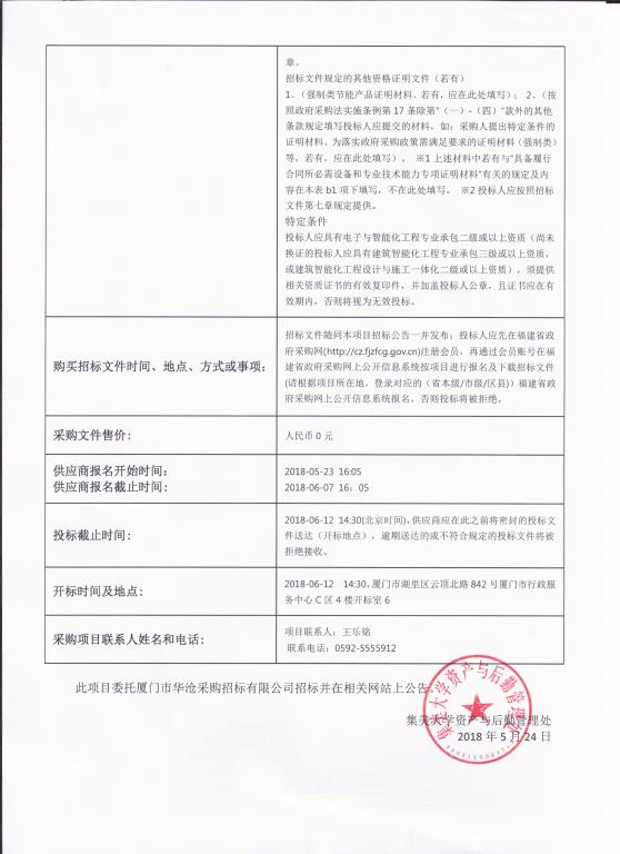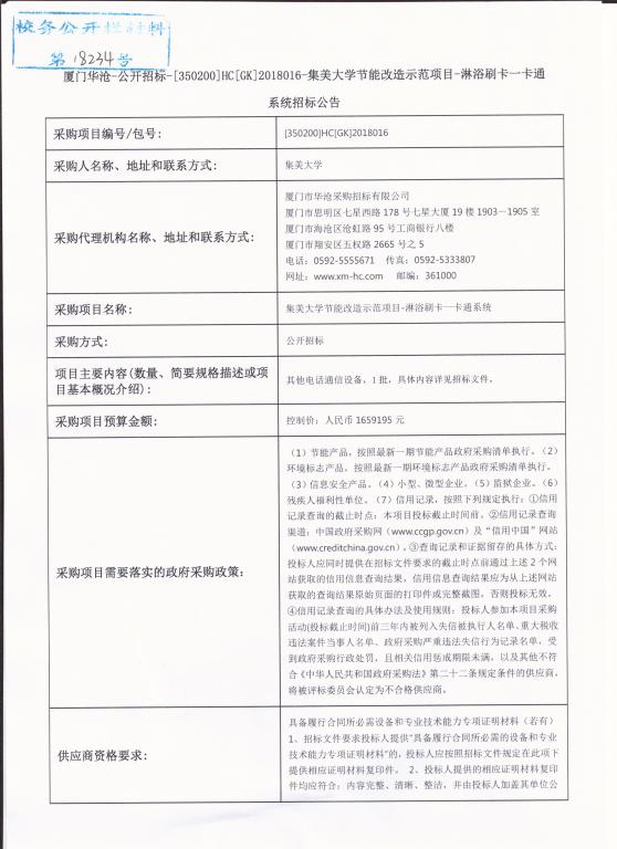 厦门华沧—公开招标—[350200]HC[GK]2018016—集美大学节能改造示范项目—淋浴刷卡一卡通系统招标公告