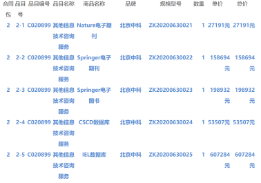 合同包 品目号 采购标的 允许进口 数量 品目号预算 合同包预算 投标保证金 2 2-1 Nature电子期刊 否 1(个) 30,000.0000 2-2 Springer电子期刊 否 1(个) 160,000.0000 2-3 Springer电子图书 否 1(个) 200,000.0000 2-4 CSCD数据库 否 1(个) 55,000.0000 2-5 IEL数据库 否 1(个) 630,000.0000 1075000 21500 |